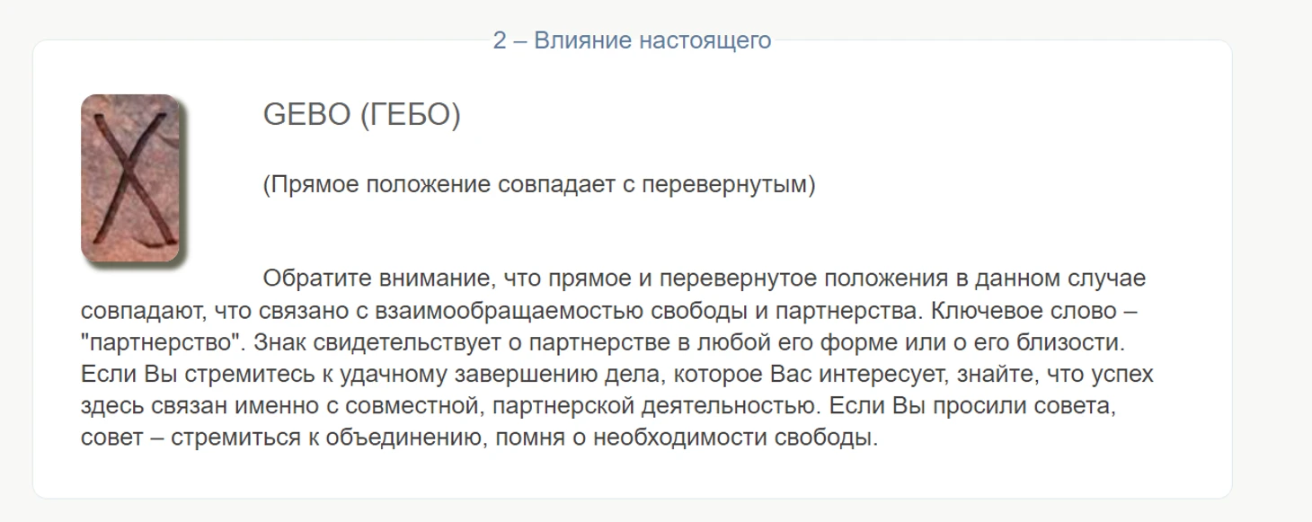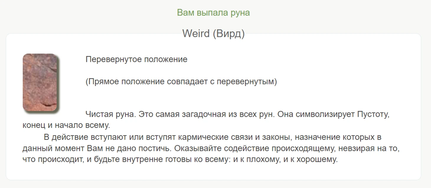Это достаточно широкий вопрос, поэтому я решил обратить к виду гадания на трех рунах – все они перевернуты и нужно по очереди вслепую выбрать три. Этот вид гадания позволяет подробнее объяснить, какие силы влияли на вас в прошлом, влияют в настоящем и будут влиять в будущем. Выбирается всего три руны: первая символизирует недавнее прошлое, вторая – настоящее, третья – будущее.