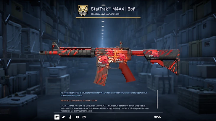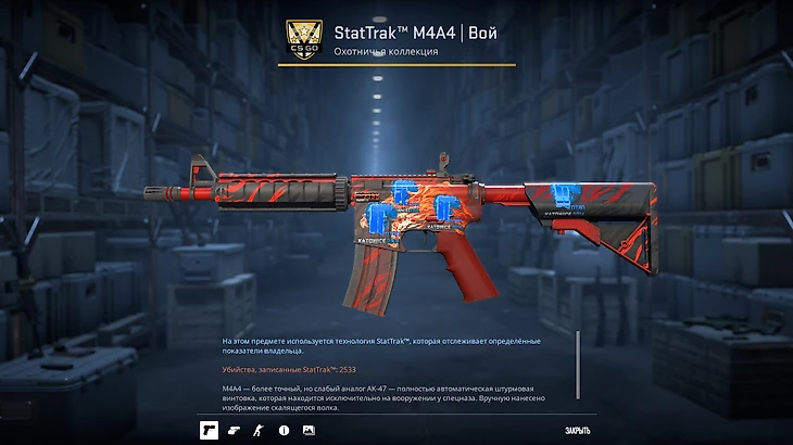 Оценить вот такую M4A4 «Вой» вообще сложно: StatTrak, качество «прямо с завода», так еще и 4 голографических наклейки Titan, каждая стоит по 5 миллионов. При продаже такой скин будет стоить минимум 15 миллионов рублей, но такие сделки случаются крайне редко.