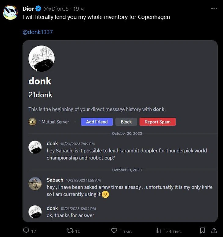 Несколько месяцев назад появились скриншоты старых переписок Донка, когда он пытался получить скины на время.