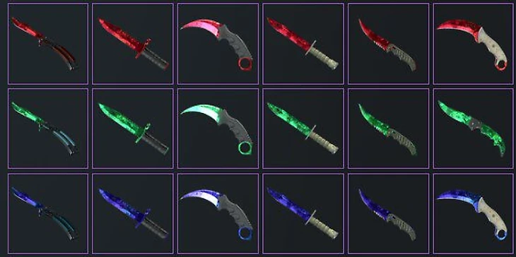 Среди ножей самые дорогие раскраски – редкие паттерны для «Волн»: «Рубин», «Изумруд» и «Сапфир». Визитная карточка любого коллекционера – полная коллекция из них на несколько популярных ножей. Стоимость от 25 миллионов рублей, но из-за хорошего качества их коллекции могут быть в несколько раз дороже.
