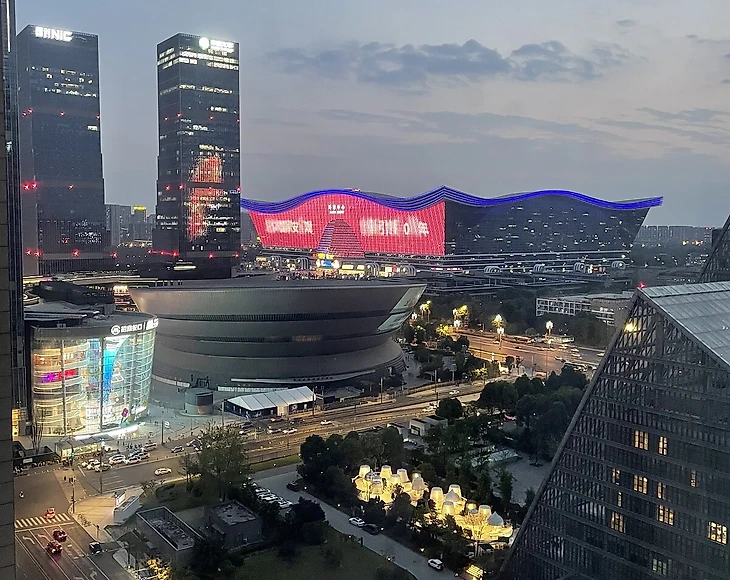 После заселения в номер я выглянул в окно и с удивлением обнаружил, что арена для IEM Chengdu расположена буквально в двух шагах от отеля. Правда, поначалу наивный я подумал, что матчи будут проходить в большом строении с красными огнями на заднем плане. На самом деле необходимая мне арена в форме чашки для хлопьев была немного ближе. А сзади находится глобальный центр «Новый век» – это крупнейшее цельное здание в мире с кучей магазинов, офисов и отелей. Там я на следующий день почти потеряюсь.