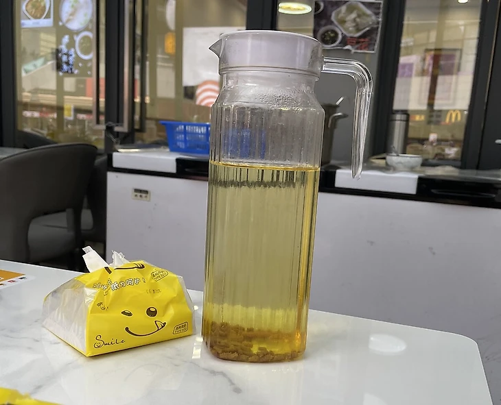 Пить в Китае можно брать и отдельно, но, как правило, в уличных заведениях вам всегда вынесут какой-нибудь напиток. И очень редко это оказывается обычная вода. К примеру, в этом же заведении нам предложили опробовать графин с какой-то странной жижей, по вкусу напоминающей печенье. Если кто-то разбирается в китайских деликатесах – расскажите про этот напиток в комментариях.