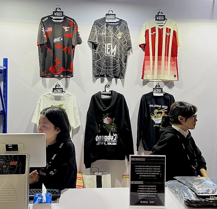 На первом этаже расположены: стенд энергетиков Monster, закуток DHL с компами, где можно поиграть в CS 2, ближе к сцене – фуд-корты (они идентичные и есть на каждом этаже), ESL Shop и пункт выдачи ништяков для обладателей трехдневных билетов первой категории за ¥3888 ($540). Я думал прикупить немного свэга, но выбор оказался довольно скудным и мне ничего не приглянулось.