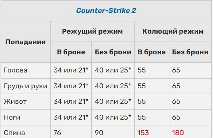 Все ножи в игре наносят одинаковый урон, показатели никак не отличаются от CS:GO. При этом в прошлых версиях игры урон сильно отличался. В CS: Source колющий удар отнимал всего 15 ХП, а в CS 1.6 при попадании в голову снималось 60 ХП.