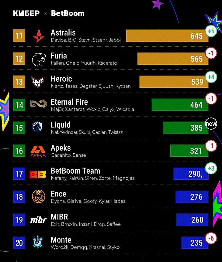 третья – прочие ланы, например IEM Dallas и BetBoom Dacha, от 450 очков за первое место до 38 за топ-16;