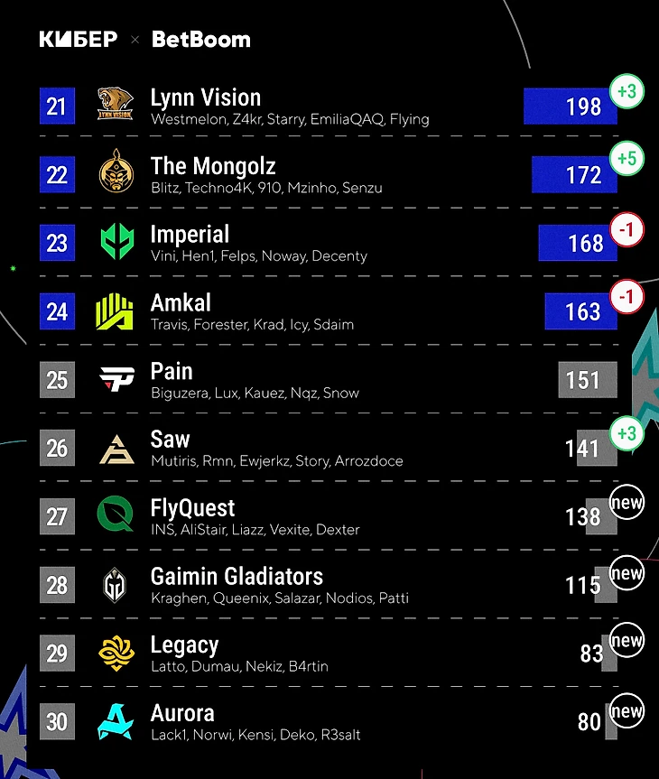 ● Вероятно, это последняя итерация рейтинга с Cloud9 в топе. После подписания трех новых игроков клуб потеряет все очки, как это уже случилось с GamerLegion, вылетевшей из топ-30. Возвращаться будет очень сложно.