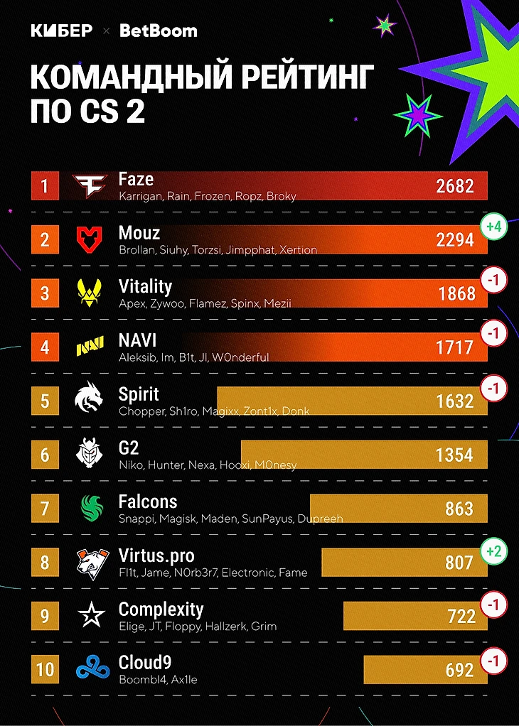 После мейджора в CS прошли три крупных турнира: IEM Chengdu, ESL Pro League 19 и BetBoom Dacha Belgrade. С их учетом рейтинг команд сильно изменился, но лидер остался прежним – Faze занимает первое место с небольшим отрывом. И у нее новый преследователь – Mouz, вышедшая на пик формы.