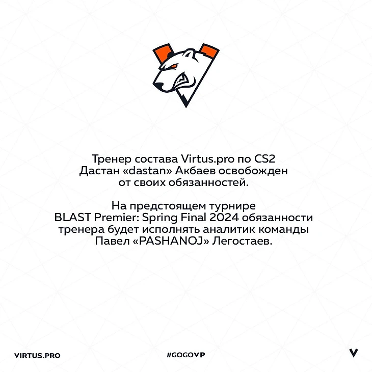 <...> Мы с Дастаном вместе пришли к выводу, что сейчас – в нынешней конфигурации состава по CS2, актуальной мете, со всеми этими изменениями, в том числе маппула - ресурс нашего эффективного взаимодействия исчерпан. В результате обмена мнениями мы договорились поставить на паузу наше сотрудничество с Дастаном в качестве тренера основы».
