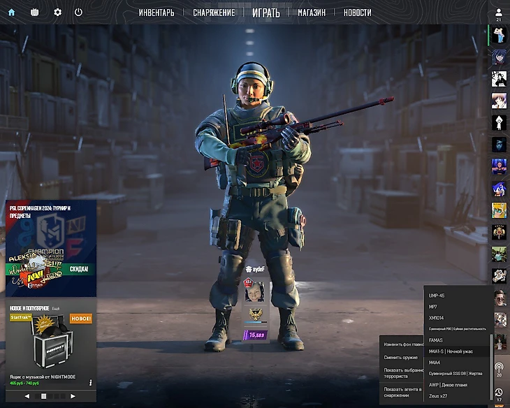 Чтобы поменять оружие, которое держит агент в лобби, нажмите на шестеренку, находящуюся в правой нижней части экрана, перейдите в меню «Сменить оружие» и выберите нужную пушку. Агентам доступны только девайсы их стороны, поэтому чтобы взять AK-47 вам нужно сначала поменять модель на персонажа атаки. И наоборот, если у вас стоит агент атаки, то, чтобы взять M4, вам нужно поменять его на спецназовца.