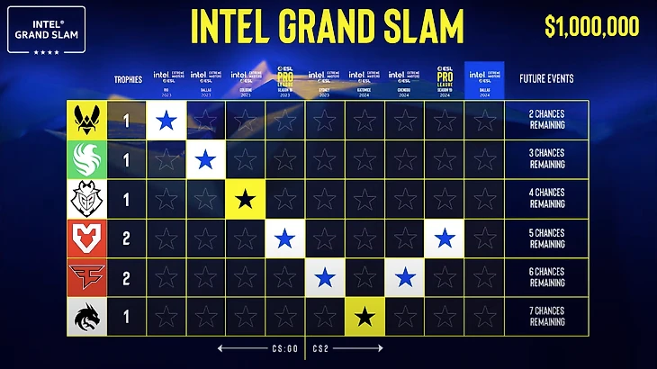Напомним, что это внеигровое соревнование, победа в котором достанется команде, сумевшей выиграть 4 турниров ESL из 10, в которых примет участие. Одним из них обязательно должен быть IEM Katowice, IEM Cologne или другой мейджор-турнир, проводимый ESL (они отмечены в таблице чёрными звёздами).