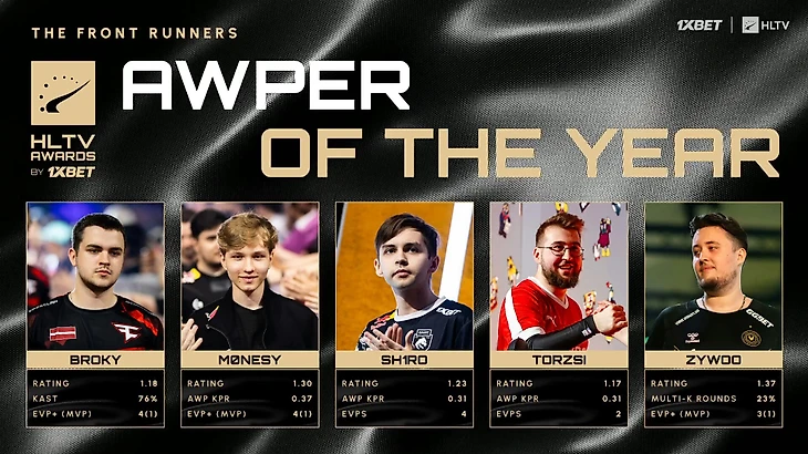 ● Пять кандидатов в номинации «Лучший снайпер» по итогам полугодия: Broky, M0nesy, Sh1ro, Torzsi, Zywoo.