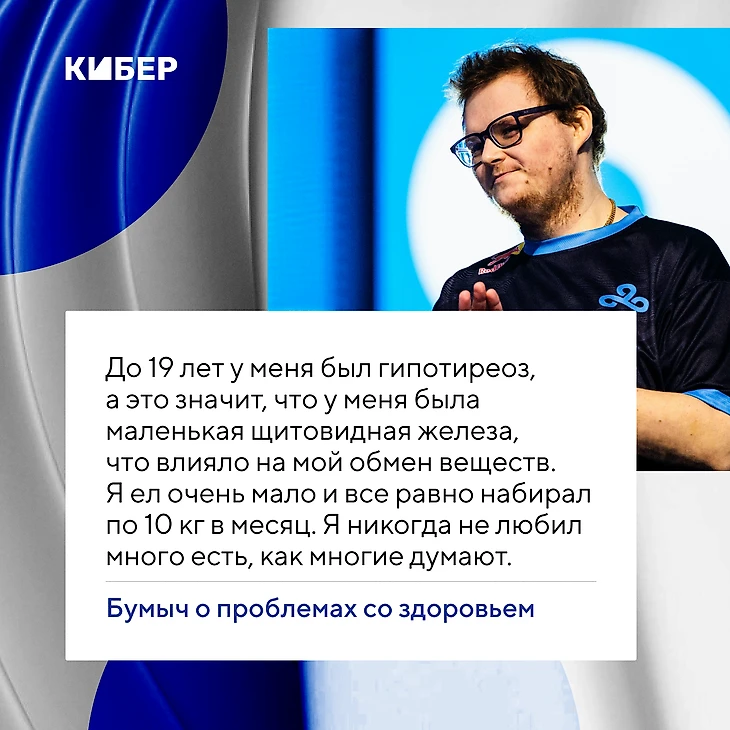 «Я обеспокоен своим лишним весом, у меня с детства был гипотиреоз [Кибер: недостаток гормонов щитовидной железы], был плохой обмен веществ. Из-за этого я начал набирать лишний вес примерно с 6-7 лет. К 18 годам моя щитовидная железа выросла, было отклонение от нормы на 2 сантиметра. Сейчас отклонение значительно уменьшилось, все приходит в норму».