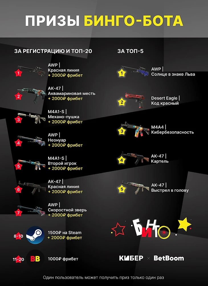 8-10-е место: 1500 рублей Steam и фрибет в 2000 рублей;