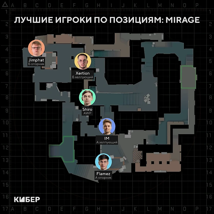 Второй важнейший элемент Mouz на Mirage – Jimpphat. Если бы позиции на карте были людьми, то он точно был бы олицетворением опорника точки Б. Хладнокровный и стабильный финн идеально чувствует себя на роли, где половина геймплея – прыжки с просмотром пуша ковров.
