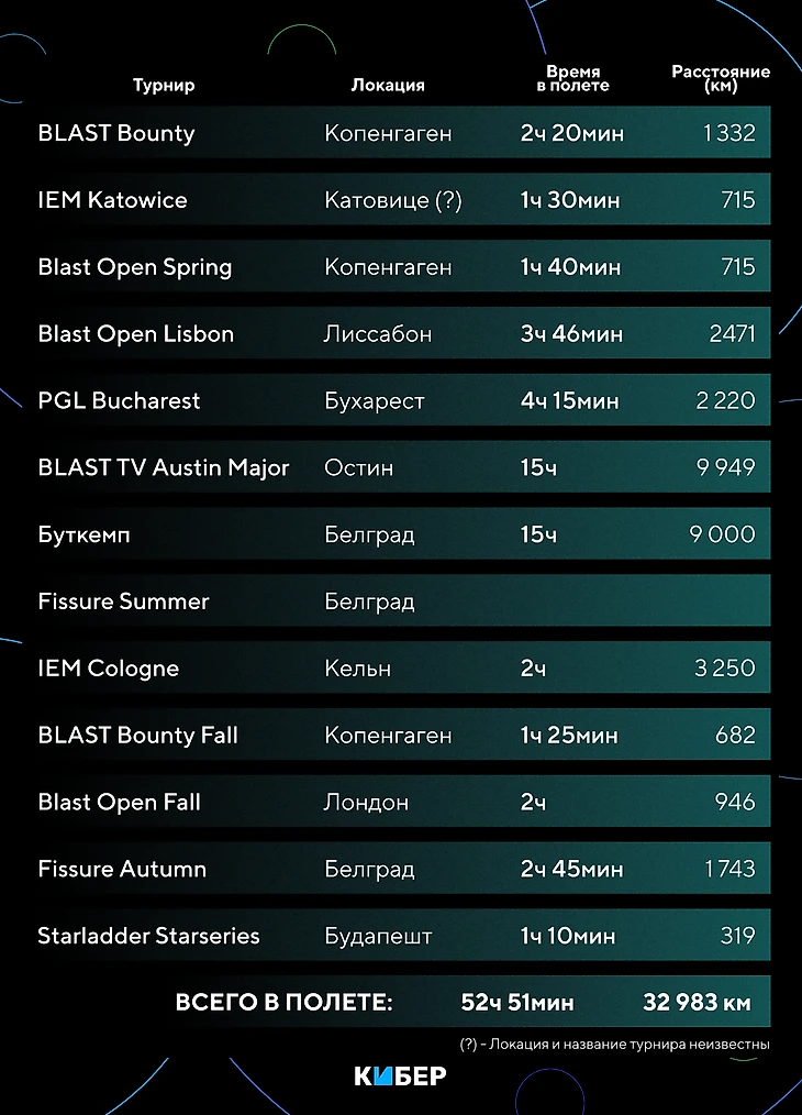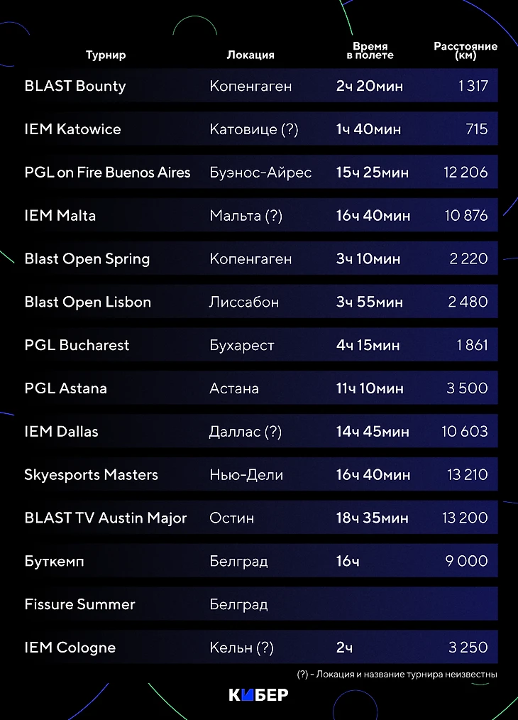 Уже известны локации турниров от всех организаторов, кроме ESL. Для подсчетов мы использовали локации предыдущих сезонов: Катовице, Кельн, Мальту, Рио, Ченду, Сидней и Даллас. Также неизвестна локация второго мейджора сезона – он не учитывается в списке путешествий.
