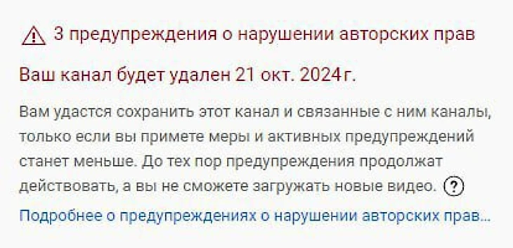 «Если вы участвуете в Партнерской программе YouTube и получили три предупреждения, вам будет дано семь дней на то, чтобы решить вопрос с нарушениями, иначе ваш канал будет заблокирован. На этот период действие предупреждений продлевается, и загрузка новых видео недоступна. Однако вы сможете заходить на канал, чтобы устранять нарушения.