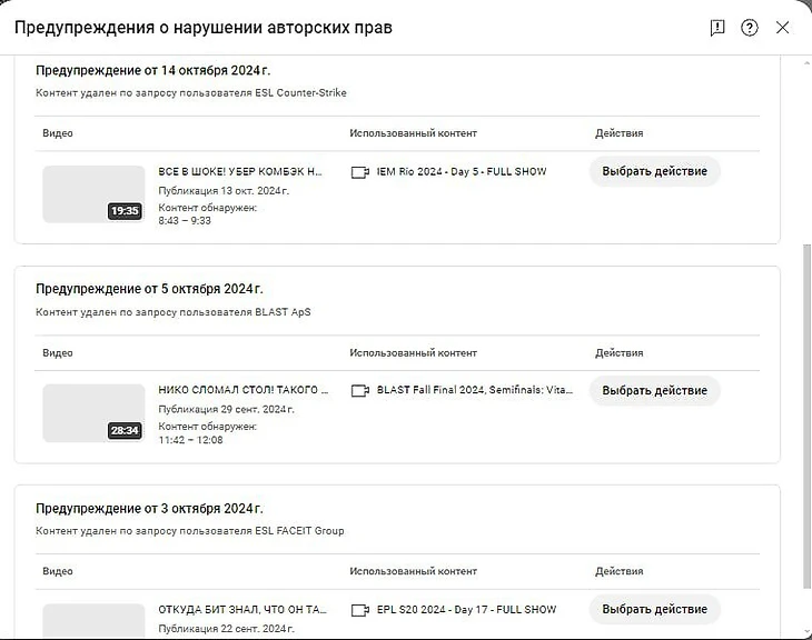 Два страйка прилетели от ESL, один от BLAST. Все произошло очень быстро – с 3 по 14 октября. Получается, восемь лет у канала Евгения не было серьезных проблем с правообладателями.