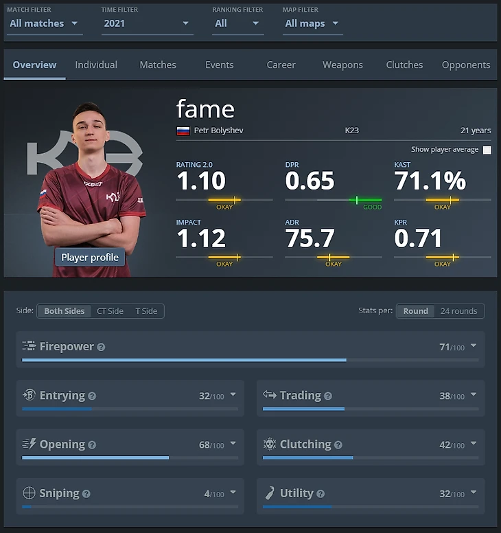 Игра за K23 стала большим шагом вперед для фейма. Он закрепился на тир 3 уровне и при этом ни чуть не просел по рейтингу. Тем не менее особо звёзд с неба в плане результатов K23 не хватали, 90% времени они играли онлайн турики-мясорубки от букмейкеров. По ходу 2021 года команда смогла набрать кондиции и даже занять топ 4 на CIS RMR. Да-да, это были те времена, когда у СНГ был свой RMR. В будущем K23 совсем немного не хватит очков для прохода на Мажор. Там еще была достаточно комичная история, где из-за сетки и глупых правил K23 было выгоднее проиграть один из матчей. Из интересных командных результатах за тот год - пара побед на тир 3 онлайнерах.