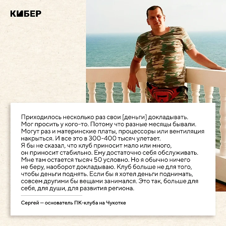 «Естественно, даже чтобы открыть ПК-клуб, нужны хорошие деньги. В VIP-зале одно место порядка полумиллиона стоит. Как обычный человек это потянет? У тебя должна быть сзади какая-то подушка, какой-то доход, который может это перекрыть, или хотя бы кредит. Если нет поддержки от государства или каких-то внешних источников, то практически нереально».