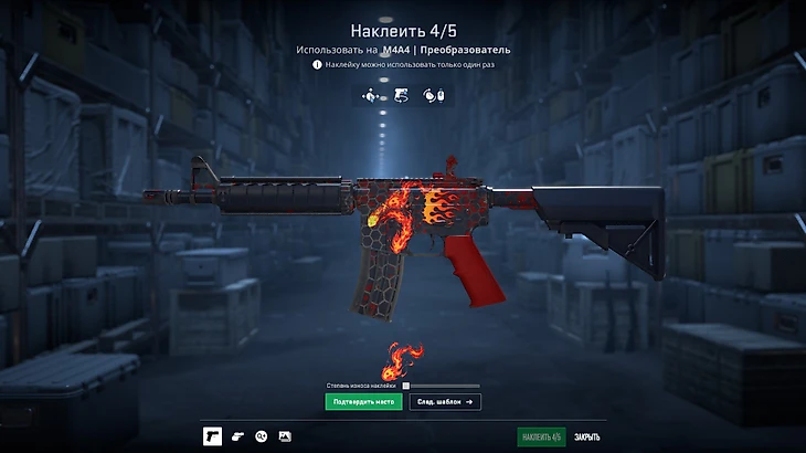 С выходом пропуска «Арсенал» появилась коллекция наклеек «Собери стихию». С ее помощью можно скрафтить M4A4, очень похожую на «Вой». Базой станет дешевая эмка «Преобразователь» – 57 рублей за «после полевых» или 140 за «немного поношенное». Также потребуются: