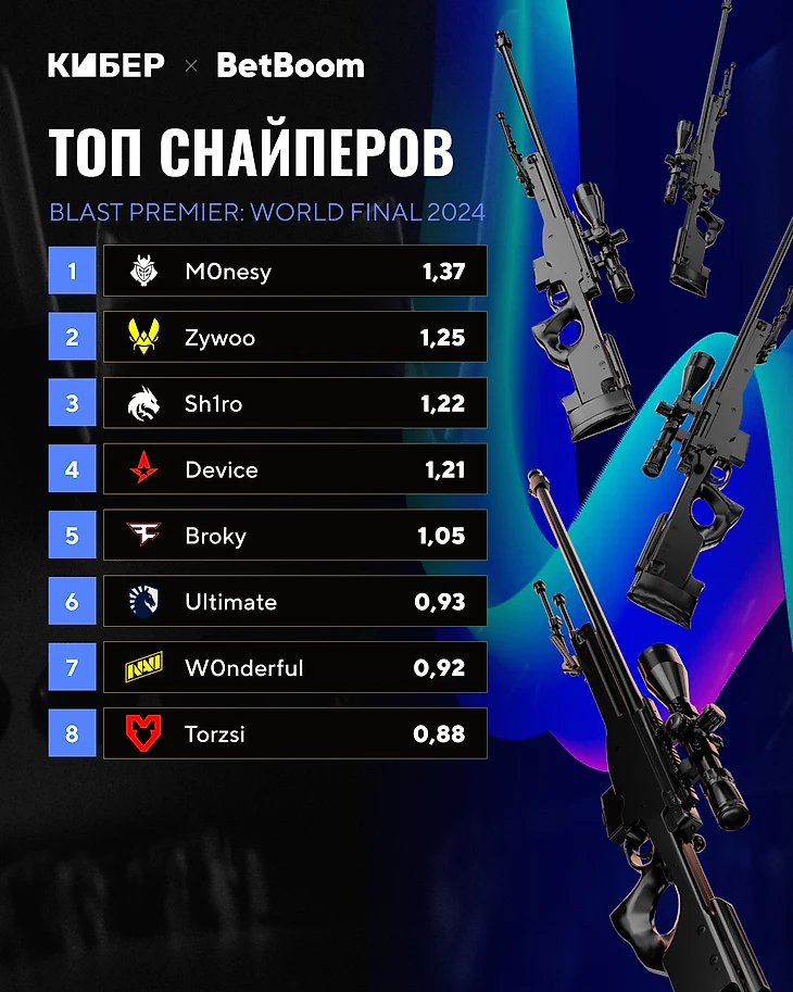 ● M0nesy с отрывом лучший игрок турнира – 1,37 против 1,25 у второго Zywoo. Илье сильно помог финал, до которого Донк, Широ и Зайву были намного ближе. Niko, Malbsmd и Hunter вошли в топ-10 рифлеров, а Snax закончил турнир с положительным рейтингом 1,01.