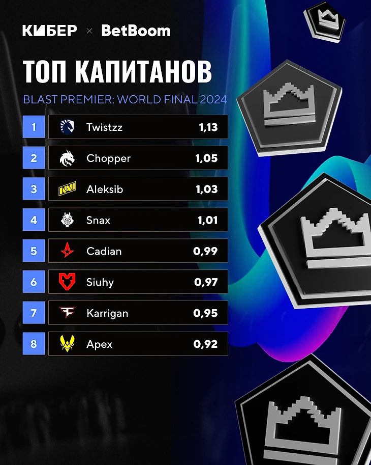 ● Donk и Sh1ro пропали в финале, из-за чего их итоговый рейтинг за турнир – 1,22 и 1,21. В топ рифлеров также попал Zont1x с 1,11, а Chopper – топ-2 капитан турнира с 1,05.