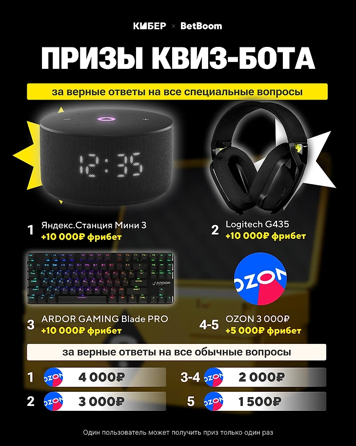4-5-е место: Сертификат OZON на 3000 рублей и фрибет на 5000 рублей.