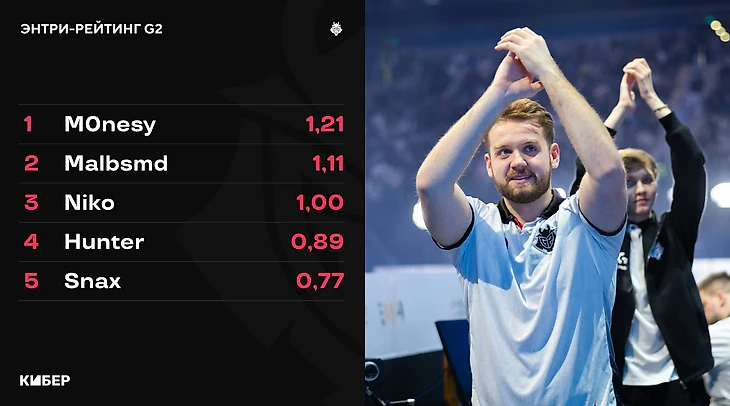 Причем у G2 тотальная беда с энтри-фрагами за атаку: лучший – Malbsmd с рейтингом 1,04. Для сравнения, у Зайву – 1,12, а у Донка – 1,16.
