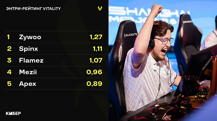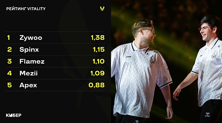 Vitality: Zywoo – 70%, Spinx – 30%.