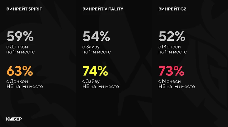 ● Винрейт, когда керри на первом месте, примерно одинаковый (особенно с поправкой на РМР Монеси, где он сыграл неважно – с рейтингом 1,00). А вот когда у керри не идет, Spirit действительно сложнее, чем G2 и Vitality. Существенно ли? Да не сильно.