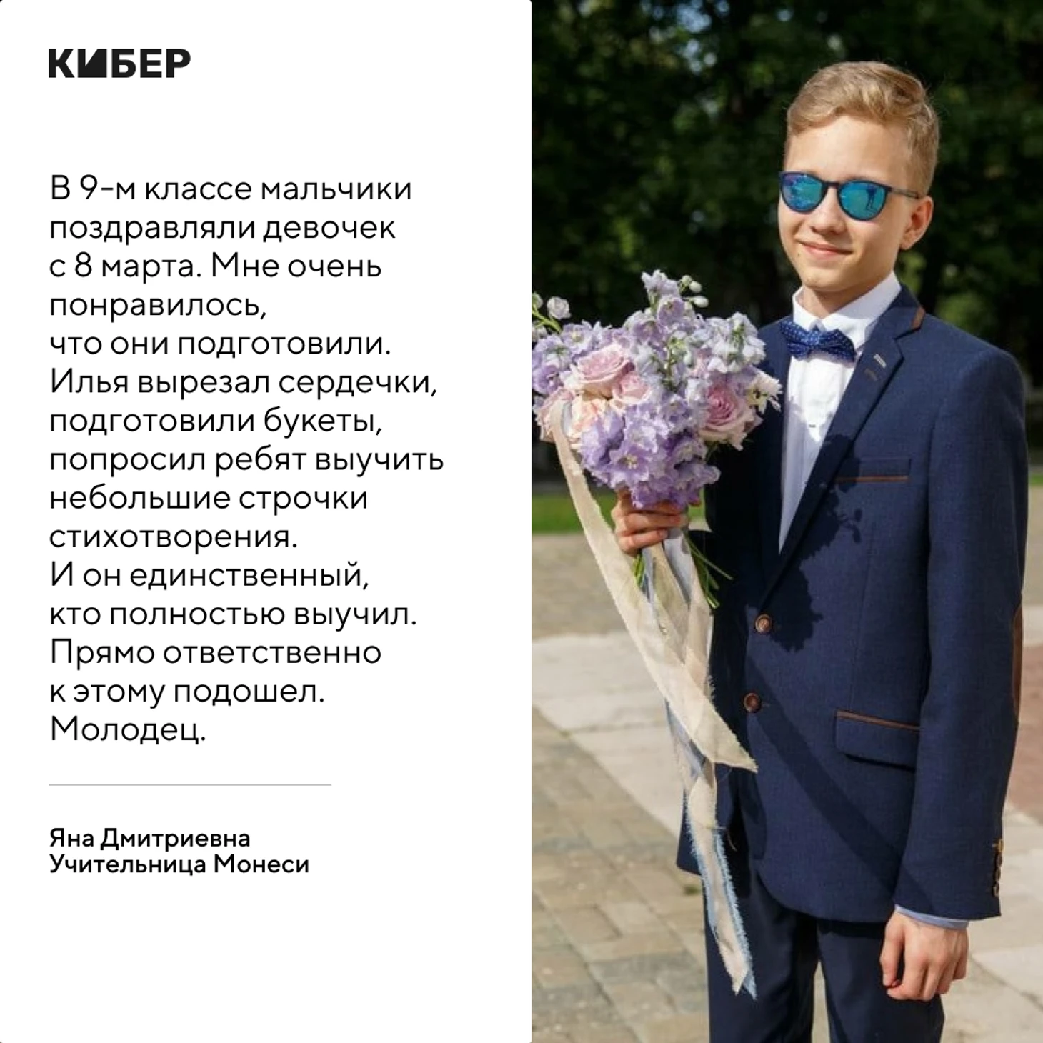 Особенно Илья отметился при поздравлении одноклассниц на 8 марта. «В 9-м классе мальчики поздравляли девочек с 8 марта. Мне очень понравилось, что они подготовили. Илья вырезал сердечки, подготовили букеты, попросил ребят выучить небольшие строчки стихотворения. И он единственный, кто полностью выучил. Прямо ответственно к этому подошел. Молодец».