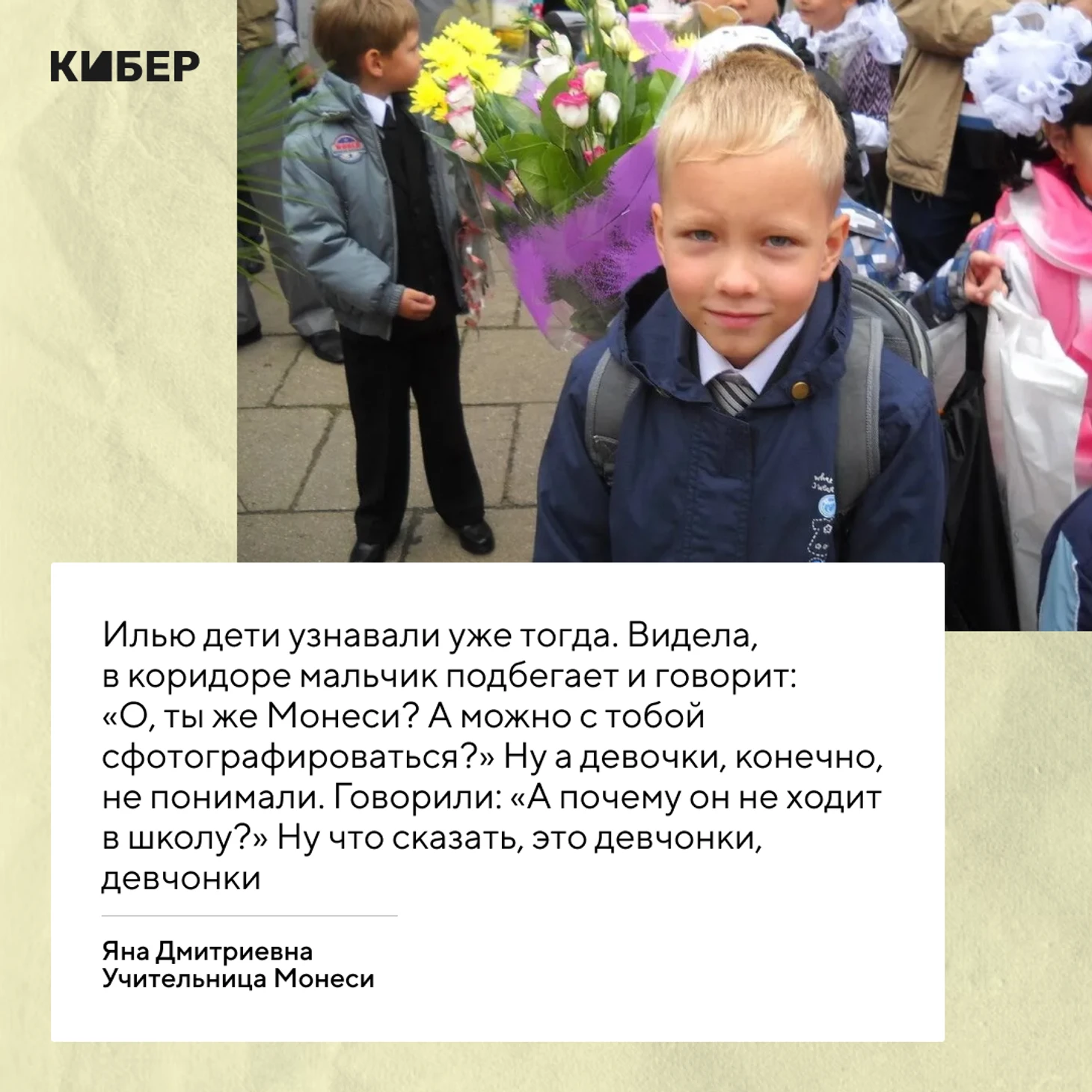 «Он был такой маленький, маленький, маленький, светленький мальчик в костюмчике, в галстучке. Хорошенький, безобидный, такой крошечный. Вот прямо маленький, маленький зайчик».