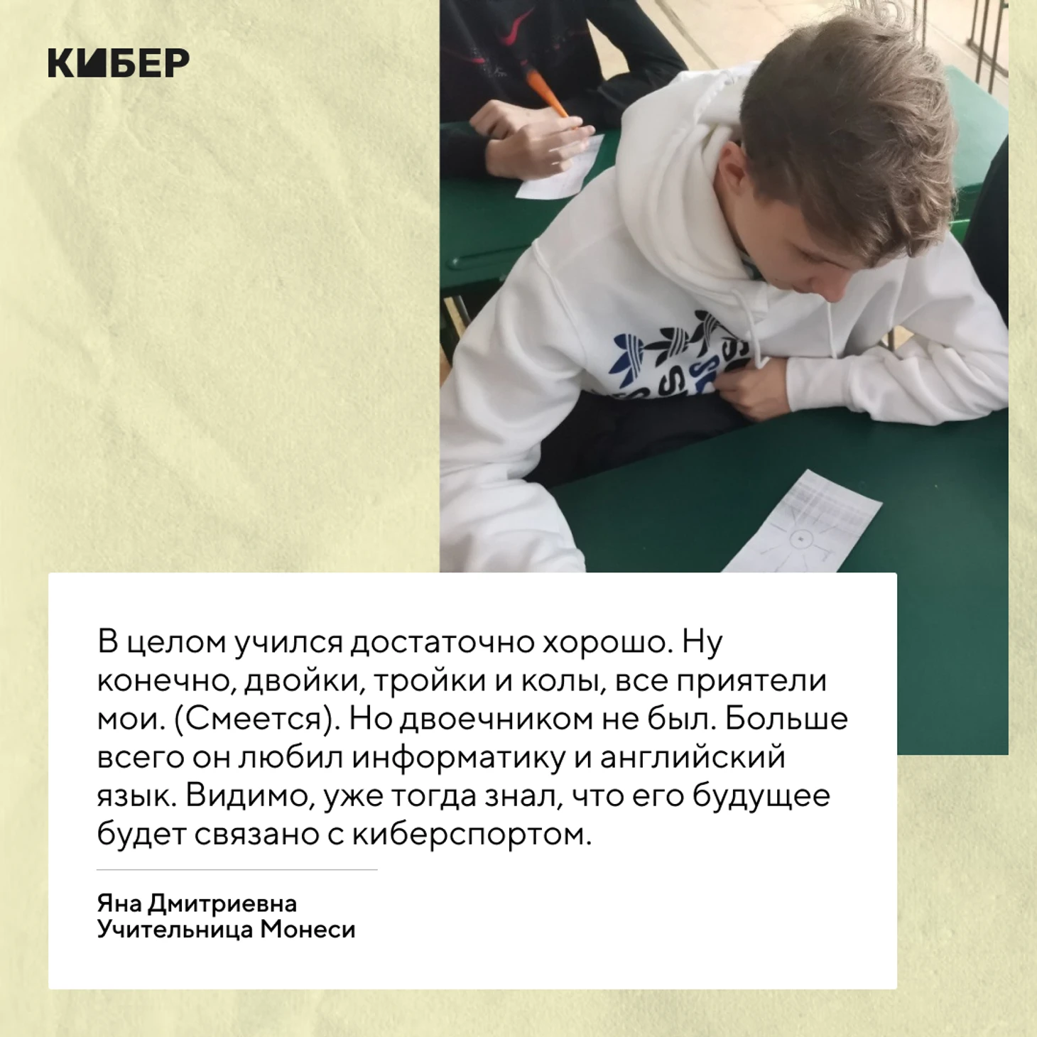 Классная руководительница – это Яна Дмитриевна Ткачук. Учитель русского языка и литературы в школе №16 города Орехово-Зуево. Мы поговорили с ней о Монеси.