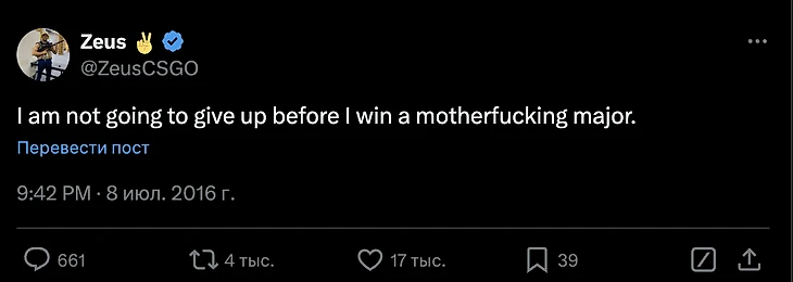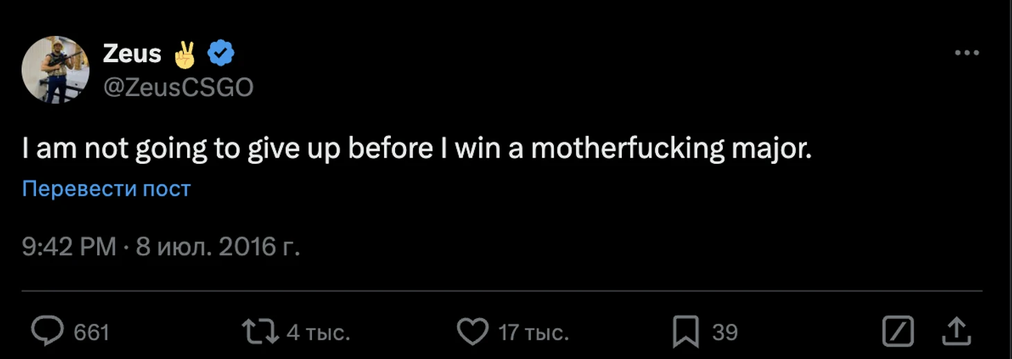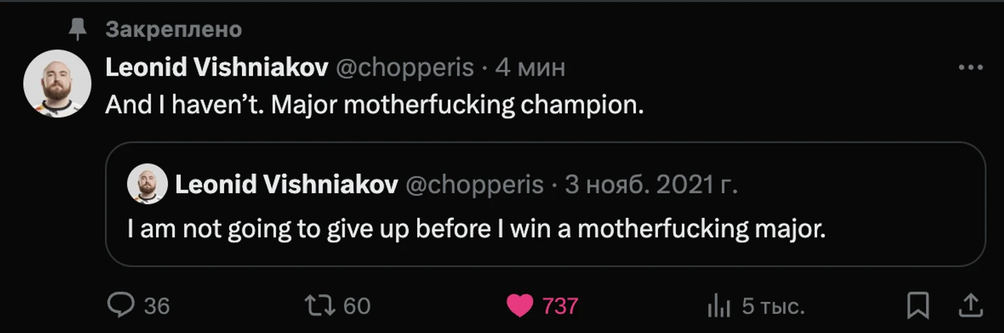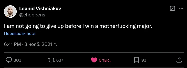 В 2021 году Spirit уступила в решающем матче против Astralis за выход в основную стадию мейджора. После того поражения Чоппер повторил легендарный твит Зевса.