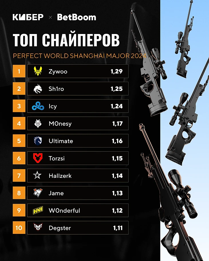 ● В топ-5 снайперов ожидаемо попал M0nesy и Ultimate из Liquid. А на третьем месте внезапно Icy из Cloud9 с 1,24, хотя его команда даже не вышла в Elimination Stage. Jame с 1,13 также попал в десятку, как и его тиммейт Норберт с 1,16. Virtus.pro оказалась в уникальной ситуации: у всех игроков рейтинг выше единицы, при этом команда вылетела со счетом 1-3.