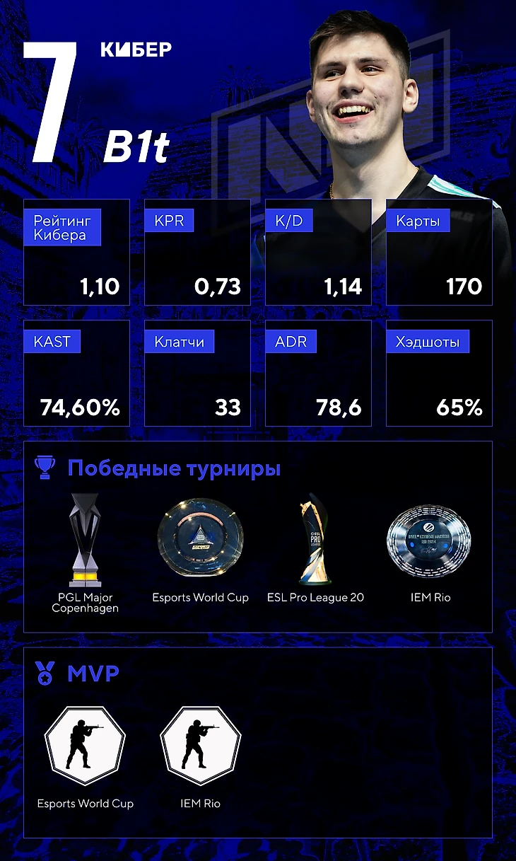 В прошлом году Бит не попал в десятку Кибера: NAVI не вышли в плей-офф единственного мейджора, да еще и не выиграли ни одного турнира. А уже в марте 2024 года NAVI выиграли мейджор в Копенгагене – B1t стал третьим игроком команды с рейтингом 1,06.