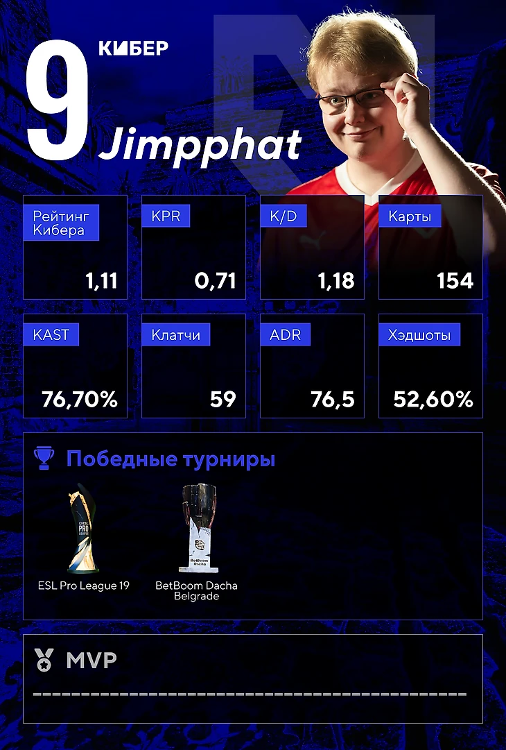 У Mouz две победы за сезон: EPL 19, на котором Jimpphat с рейтингом 1,19 вошел в десятку лучших игроков, и BetBoom Dacha Belgrade – 1,11 и очередное попадание в десятку. Но лучший турнир для Джимми – EWC 2024, на котором Mouz вылетела в полуфинале, зато он сыграл с невероятным рейтингом 1,31 и был настоящей звездой.