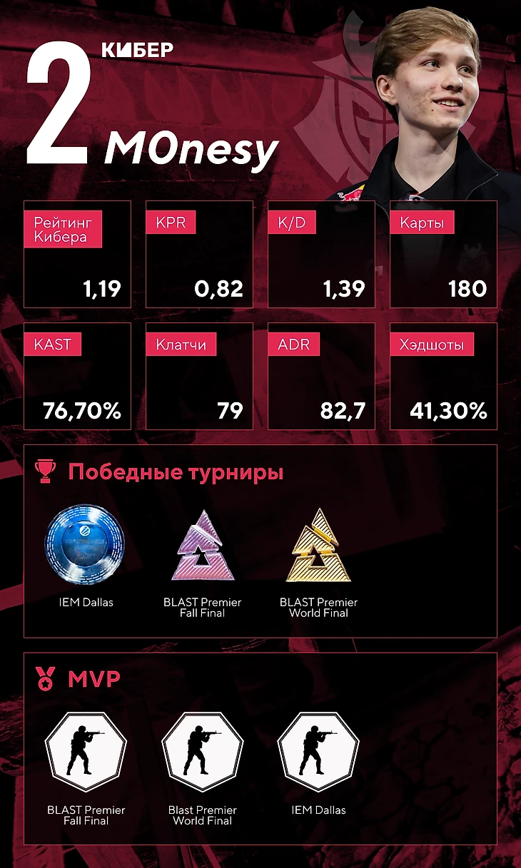 У Ильи было 10 прекрасных месяцев: 1,21 в Катовице, 1,25 в Копенгагене и 1,33 в Кельне. Так ведь еще и три трофея: IEM Dallas и два осенних Blast. Важное отличие: если в прошлом году G2 забрала IEM Cologne и IEM Katowice, на которых лучшими стали другие игроки команды, то в этом году MVP на всех победных ивентах был Монеси.