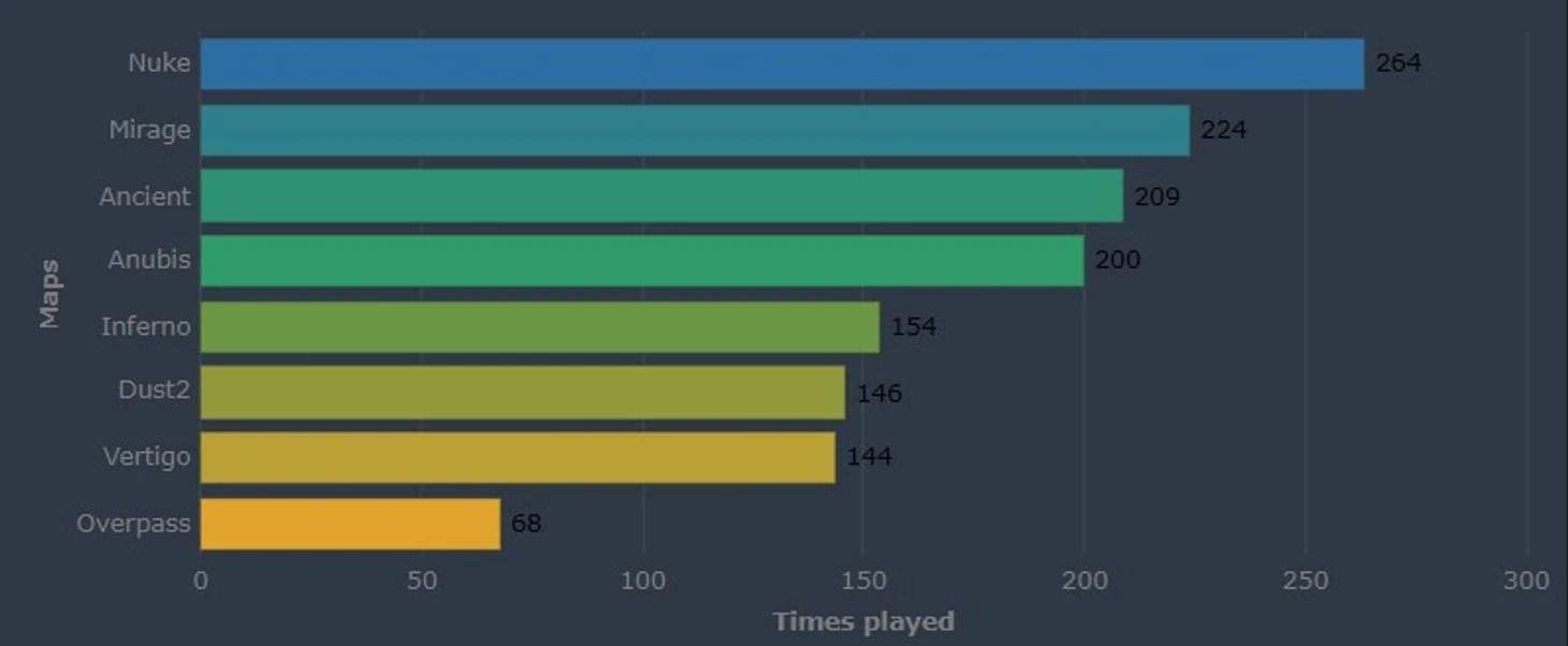 За последние 12 месяцев среди топ-20 команд HLTV Vertigo была сыграна всего 144 раза. Это наименьший показатель среди всех карт, если рассматривать весь год. Низкая популярность Overpass объясняется тем, что 26 апреля 2024 года Overpass был заменён на Dust2.