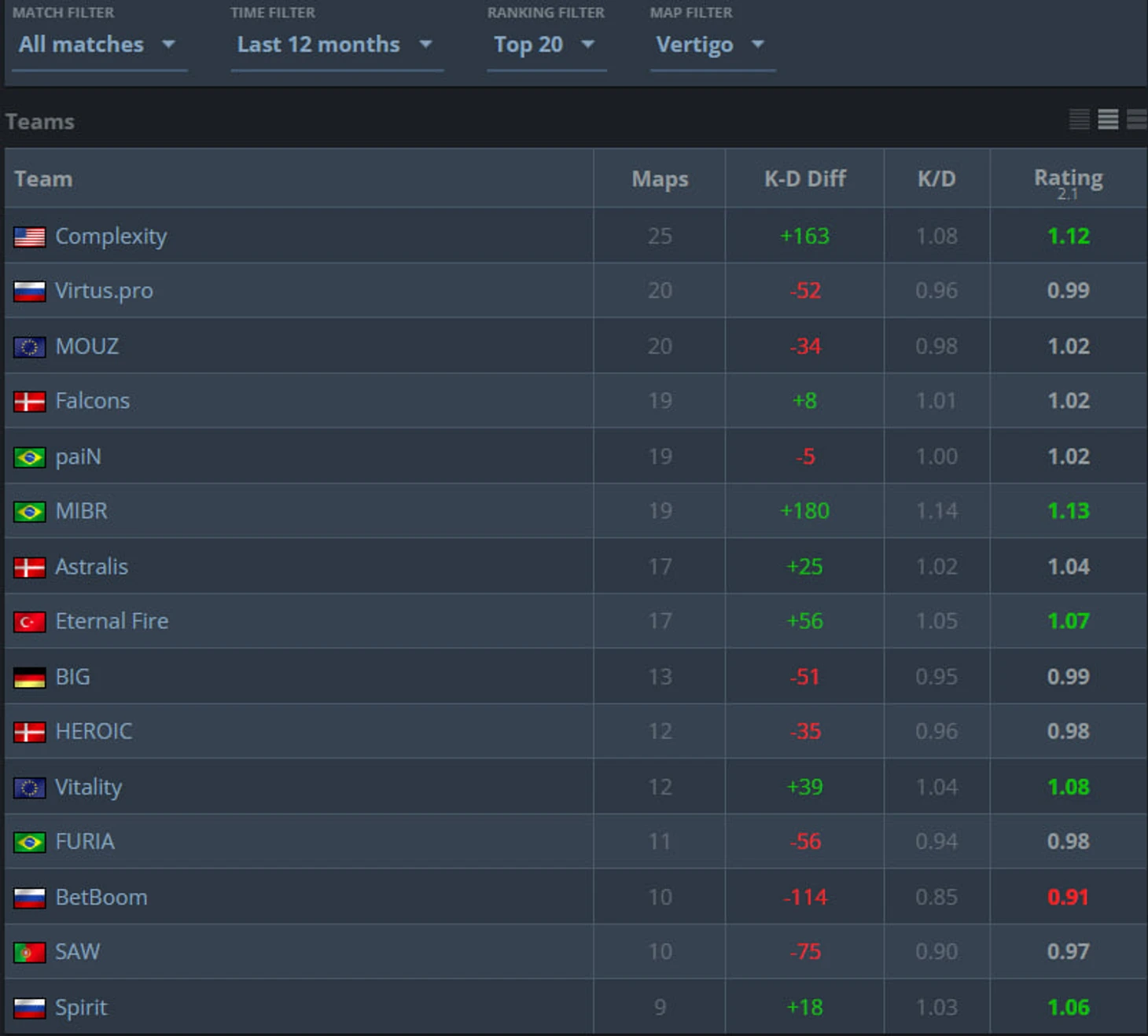 Единственная команда из Северной Америки в этом топе. Complexity сыграли 25 матчей на Vertigo за год с феноменальным показателем побед — 76%. Это была их сильнейшая карта: на других мапах винрейт не превышал 50%. Начало года ознаменовалось серией из 11 побед подряд. Однако замена Vertigo станет серьёзным вызовом для команды. С переходом на Train им придётся адаптироваться к новой карте и усиливать подготовку на других. Дополнительным фактором давления стали изменения в составе: ушли Джонатан «EliGE» Яблоновски и Рики «floppy» Кимери, которых заменили два американских новичка, не игравшие ранее на тир-1 сцене. В первых матчах они будут привыкать друг к другу. Если у их соперников не будет серьёзных проблем, то я бы ставил на поражение Complexity.