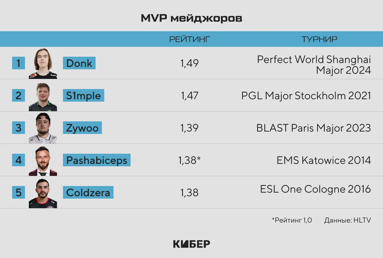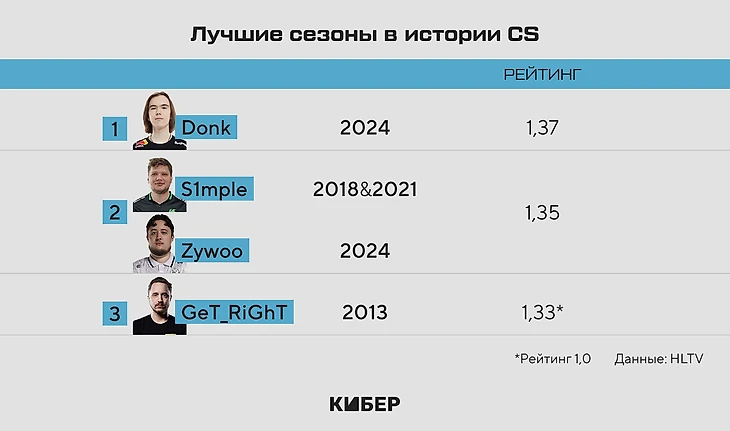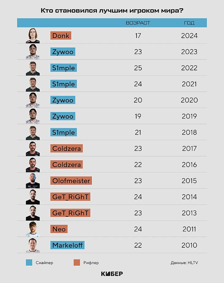 Донк прервал гегемонию снайперов: до него последний раз рифлер становился лучшим игроком мира аж в 2017 году – это был Coldzera. В 2024-м Даня соревновался не только с мегаопытным Зайву, но и с праймовым Монеси.