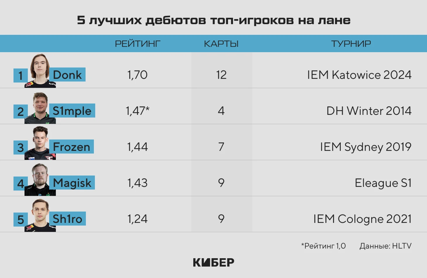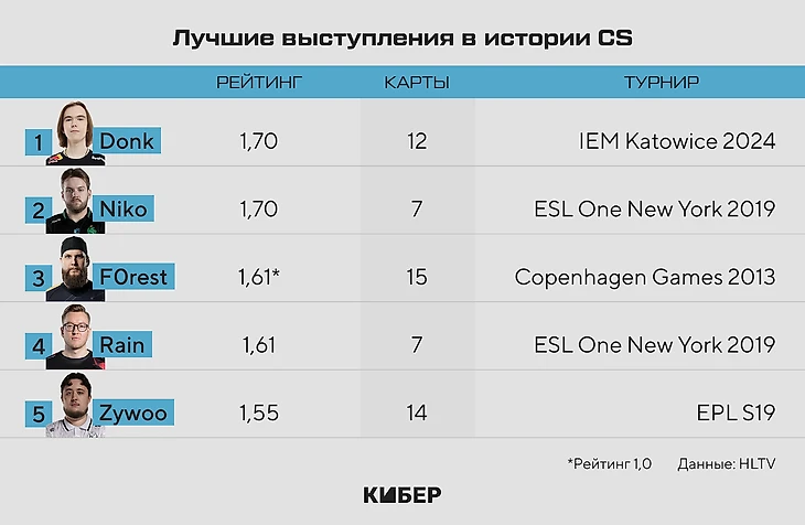 Donk с ходу задрал высочайшую планку: его рейтинг на IEM Katowice 2024 составил 1,70. Лучший дебют в истории топ-турниров. Симпл, Зайву, Нико и другие звезды и близко не подбиралась к такому аномальному показателю.