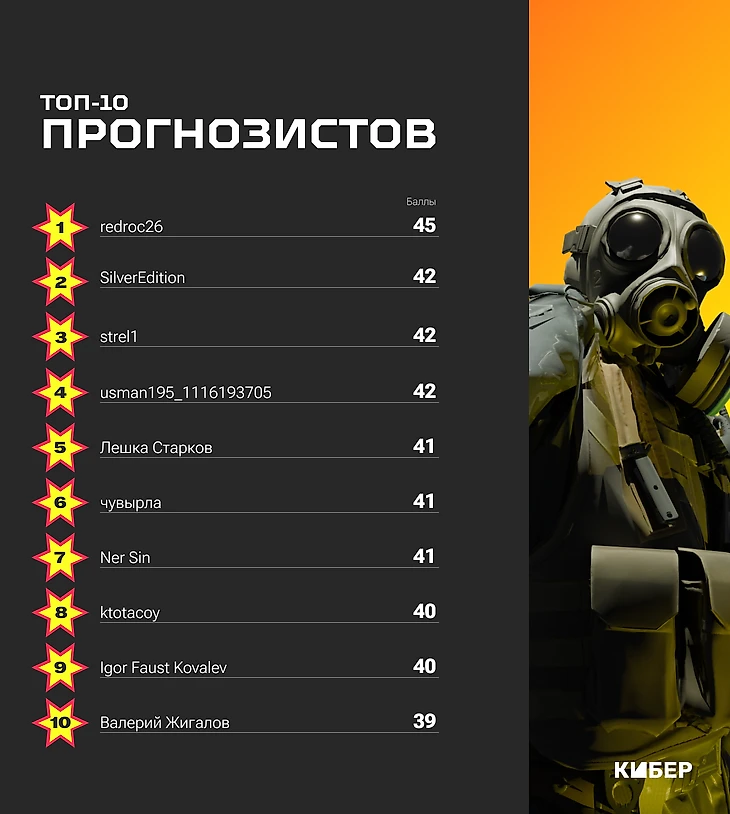 При равенстве очков у двух или более участников выше в рейтинге будет тот, кто угадал больше точных результатов. При равенстве этого показателя выше окажется тот, кто угадает больше исходов в матчах формата bo3, затем в bo2, после в bo1. При равенстве всех показателей выше будет участник, который оставил прогноз на игровой день раньше конкурента.