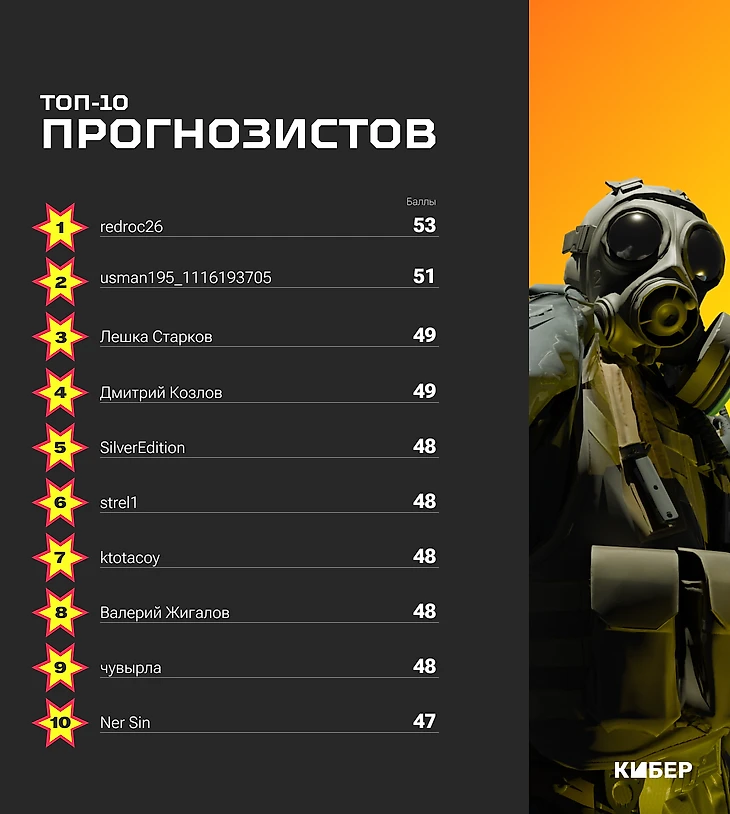 При равенстве очков у двух или более участников выше в рейтинге будет тот, кто угадал больше точных результатов. При равенстве этого показателя выше окажется тот, кто угадает больше исходов в матчах формата bo3, затем в bo2, после в bo1. При равенстве всех показателей выше будет участник, который оставил прогноз на игровой день раньше конкурента.