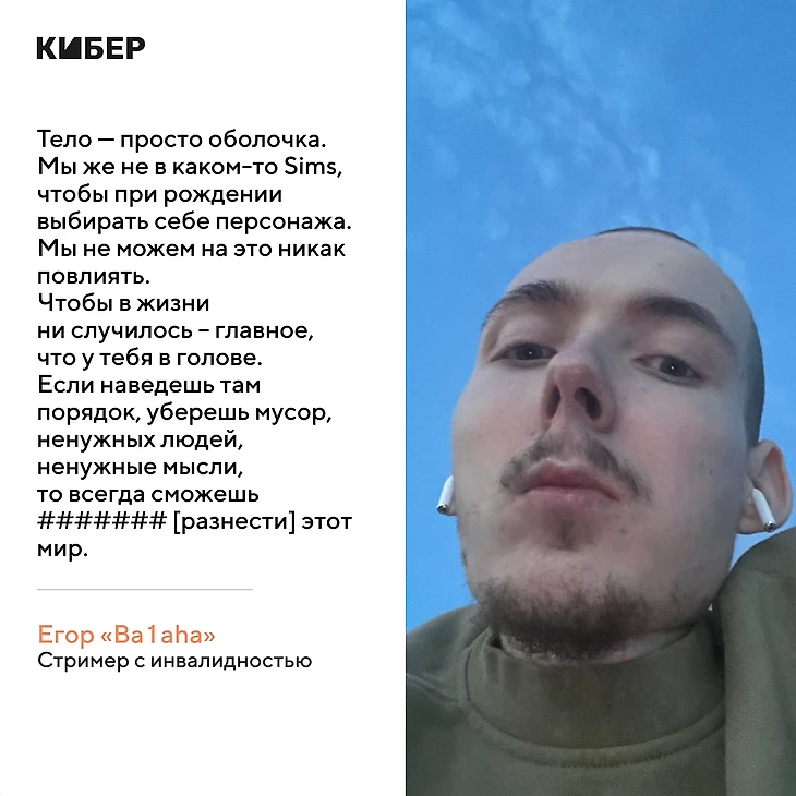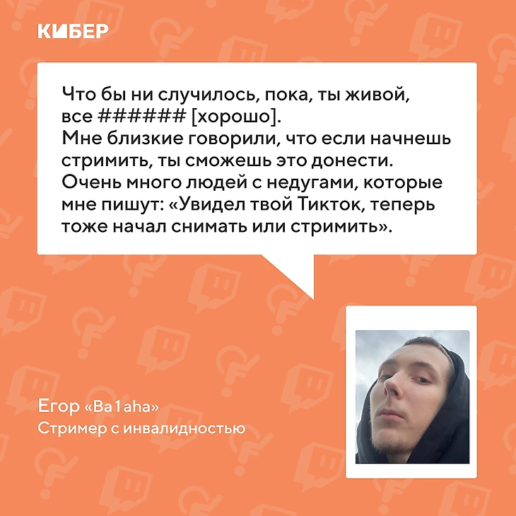 Очень много людей с недугами, которые мне пишут: «Увидел твой Тикток, теперь тоже начал снимать или стримить». То есть люди про себя думают, что они какие-то косые, больные, и боятся этого. А мне говорят: «Увидели тебя, хоть у тебя жизнь в 10 раз хуже, но мыслей таких нет».