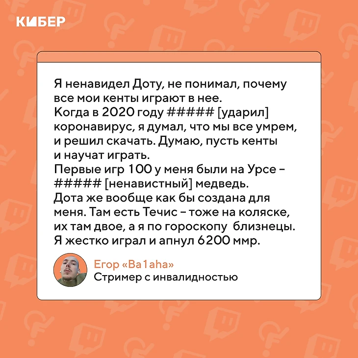 – Я ненавидел Доту, не понимал, почему все мои кенты играют в эту ##### [фигню]. Потом, когда в 2020 году ##### [ударил] коронавирус и я думал, что мы все умрем, решил скачать. Думаю, пусть кенты научат играть. И первые игр 100 у меня были на Урсе – ##### [ненавистный] медведь.