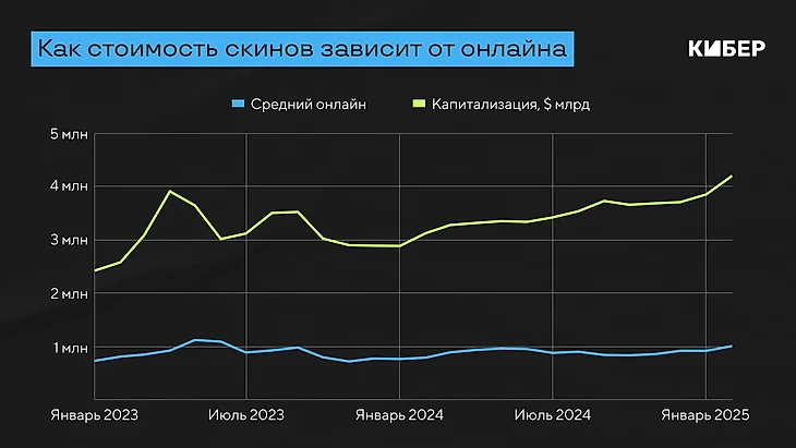 Большую часть 2024 года онлайн в CS оставался примерно на одном уровне, рост начался осенью и продолжается до сих пор: с 830 тысяч игроков в среднем в сентябре до миллиона в феврале 2025 года. Вместе с этим рынок скинов обновляет рекорд с общей стоимостью $4,348 миллиарда. Почти столько же скины стоили на пике онлайна в середине апреля 2023-го – $4,25 миллиарда.