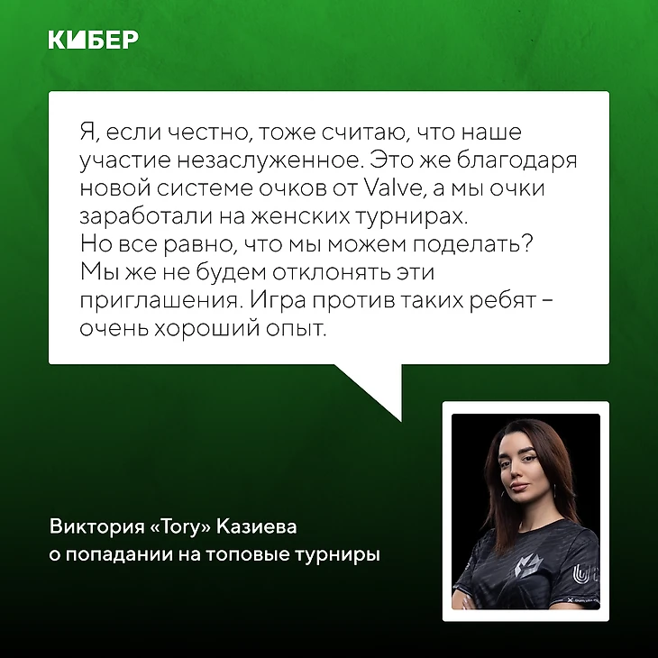– Я, если честно, тоже считаю, что это незаслуженно. Это же благодаря новой системе очков от Valve, а мы очки заработали на женских турнирах. Но все равно, что мы можем поделать? Мы же не будем отклонять эти приглашения. Игра против таких ребят – очень хороший опыт.