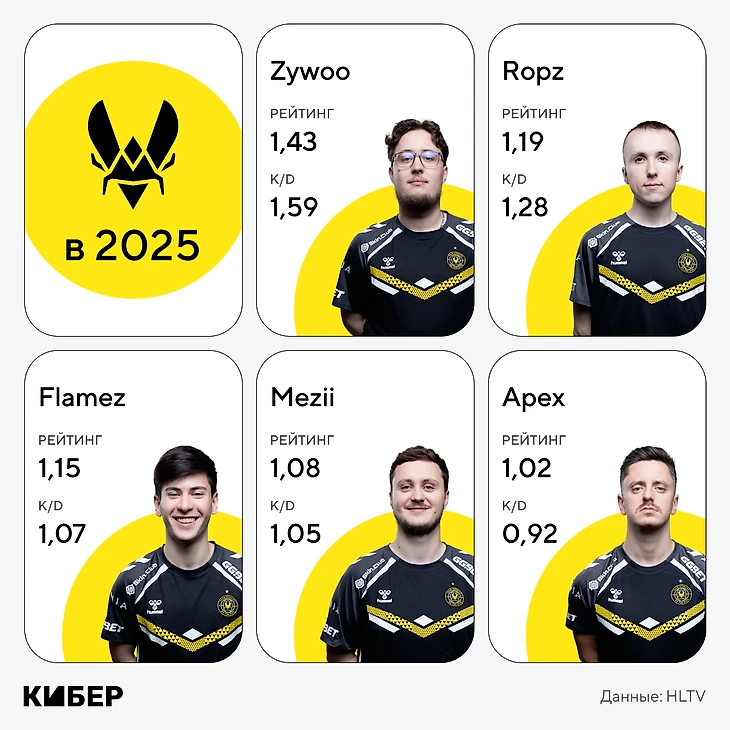 Хоть в Vitality сейчас собрались сильные игроки, про фактор Зайву забывать нельзя. А кажется, что из-за гонки Донка и Монеси за топ-1 в прошлом году про француза подзабыли (ну и неудовлетворительные результаты Vitality на это тоже повлияли, конечно). Поэтому будет не лишним напомнить, что Zywoo в 2025-м: