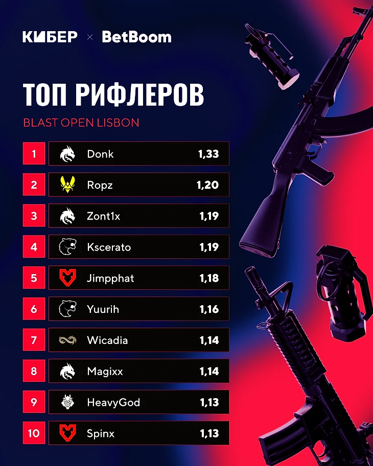 ● Следом за Zywoo идут Donk и Sh1ro – 1,33 и 1,31. На турнире Spirit либо легко побеждала, либо проигрывала, но в очень близкой борьбе, как было с Vitality и Mouz. Magixx и Zont1x также заскочили в десятку лучших рифлеров с 1,19 и 1,14.